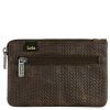 Moderno monedero de piel con textura de espiga, de hombre, en color marrón con detalles en camel en la etiqueta, con dos compartimentos con cremallera y anilla, de la marca Lois.