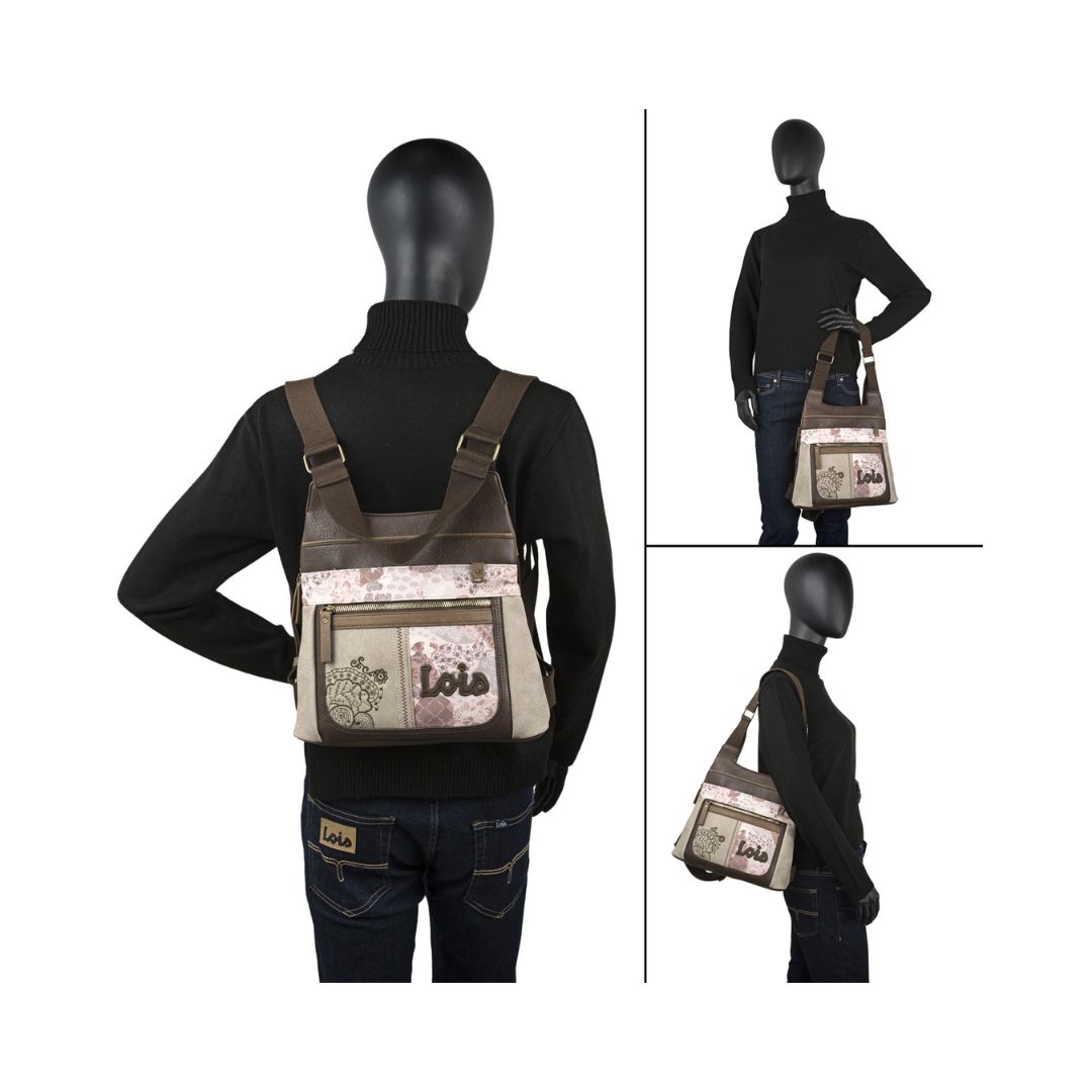 Original bolso mochila antirrobo Lois multiposición de mujer. En la parte frontal, lleva detalle del logo de la marca.